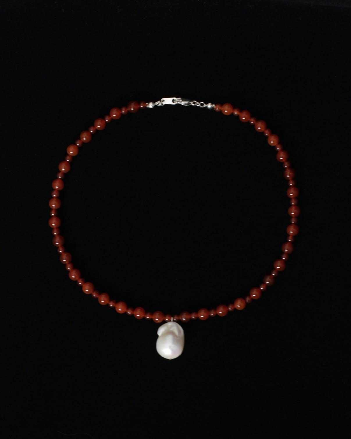 艶やかなレッドカーネリアンと、自然が生み出した一点もののバロックパール。